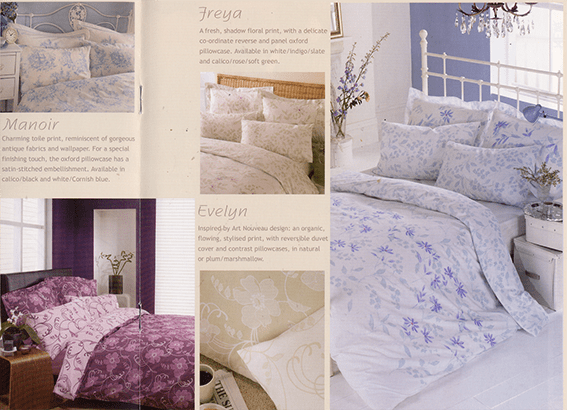Printed and Embroidered bedding designs for UK retail market. Designs are manufactured in China. Room sets are styled in Uk, working with a photographer to show the bedding at its best advantage. Often a background wall is painted in the main colour taken from the bedding.